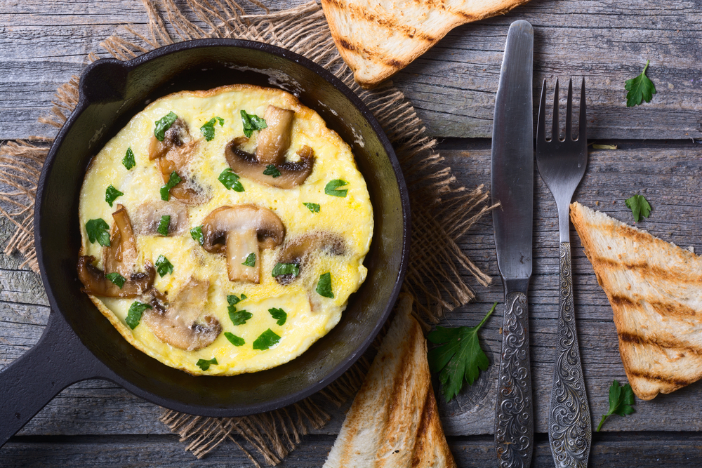 Priprema: na maslinovom ulju dinstajte šampinjone dok ne omekšaju, dodajte mladi luk, zatim jaja i začinite bijelim paprom. Uz to se može dodati i svježa vezica mladog luka ili drugo povrće poput paprike.